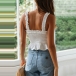 For these sun-soaked summer days,this sling top can easily strike your mind. Its alluring design details like backless,square collar and lace-up design can exude your sexy and feminine side. We suggest you matching with your high waist shorts to have a charming summer style.