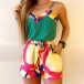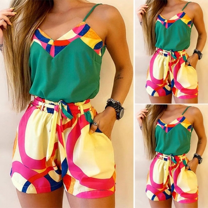 Sexy Backless V-neck Colorful Printed Sling Top + Shorts Two-piece Set