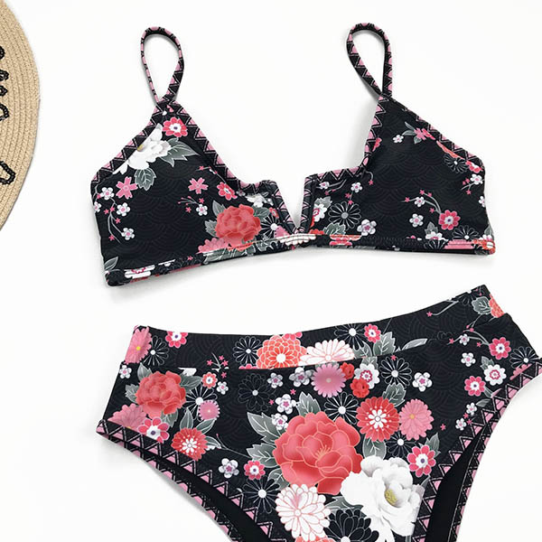 Wanna be the most charming bikini girl? Then let this bikini set help you. Its vibrant floral print details make it look so eye-catching. Including a backless v-neck bikini top and a high waist bikini bottom,this bikini set definitely can flaunt off your seductive curve.