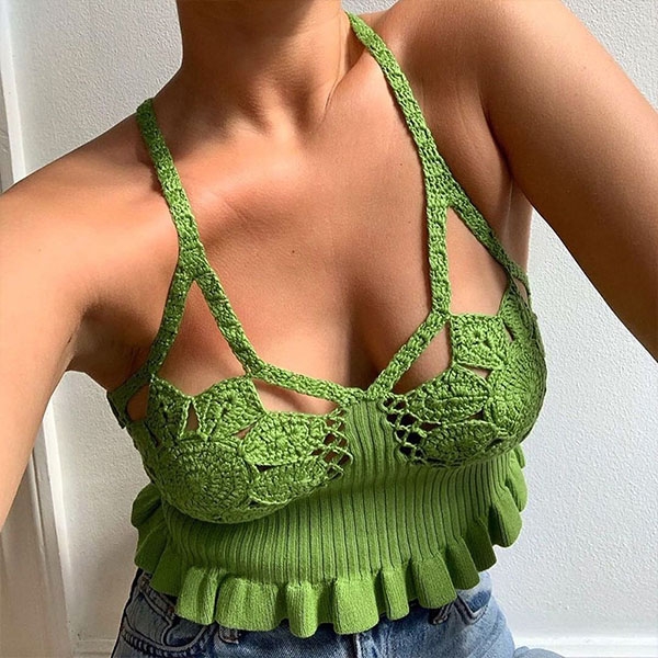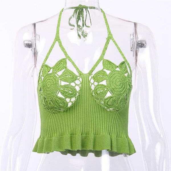 Sexy Backless V-neck Hollow Out Knit Halter Crop Top