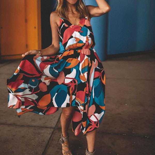 Thanks to the colorful printed details,you can look eye-catching enough in this dress. Sling style,with backless,v-neck and an irregular hem,this dress also can offer you a sexy and alluring appearance. Perfect fit for your beach days and tropical getaways.