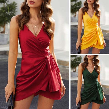 Sexy Backless V-neck Irregular Hem Solid Color Sling Dress