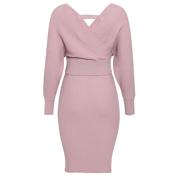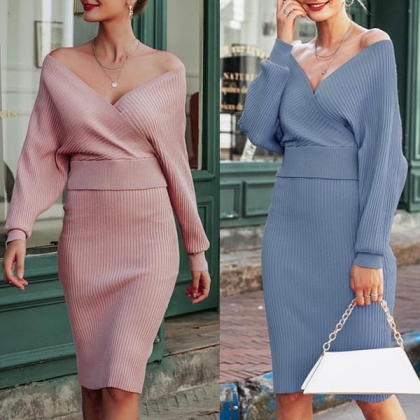 Sexy Backless V-neck Long Sleeve Knit Top + Skirt Two-piece Set
