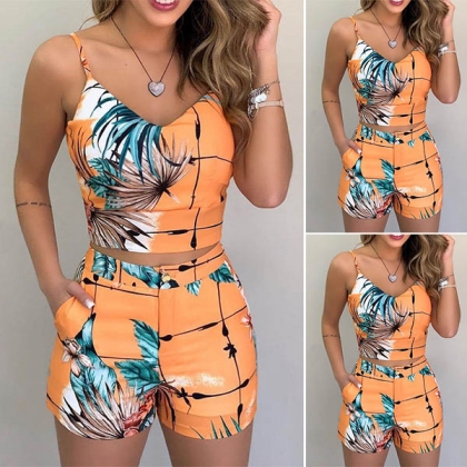 Sexy Backless V-neck Printed Sling Top + Shorts Two-piece Set