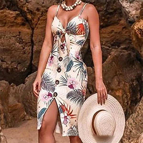 Exude your sexy and flirty vibes through this printed dress. Sling style,with backless,v-neck and slit hem design,this dress can showcase your slender figure with its fit silhouette. Front-button details will further enhance its charm. Save one for the parties and gatherings.