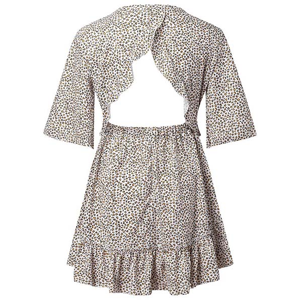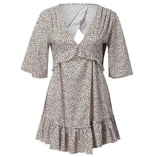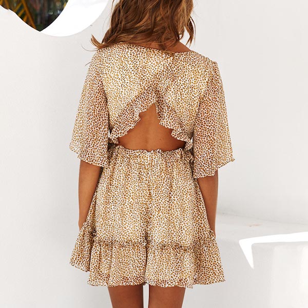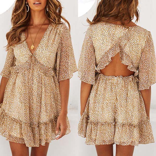 All the eyes can be focused on you once you wear this stunning dress. It features chic and eye-catching leopard printed details,the backless,v-neck,trumpet sleeve and ruffle hem design will make this piece look more alluring. For a beautiful beach look,you can trust in this dress!