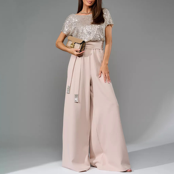 Sexig Jumpsuit med Bling-bling Paljetter, Rund Hals, Kortärmad och Självknytande Midja, Vida Ben