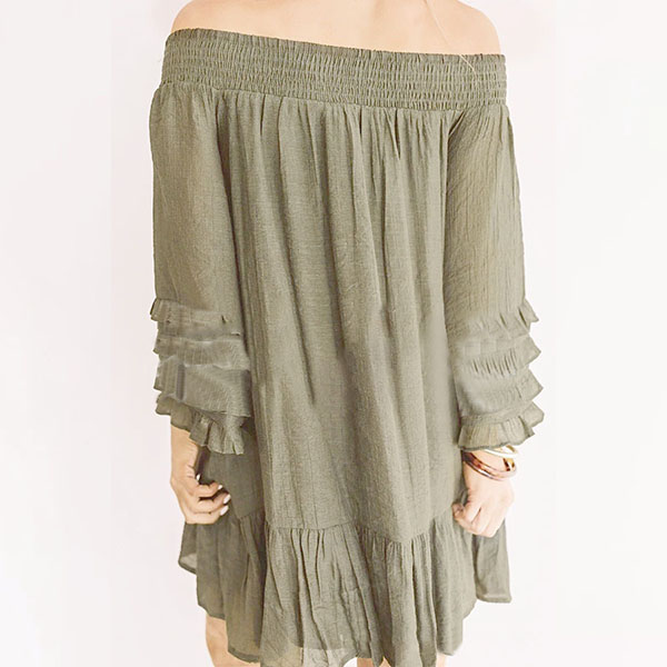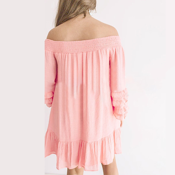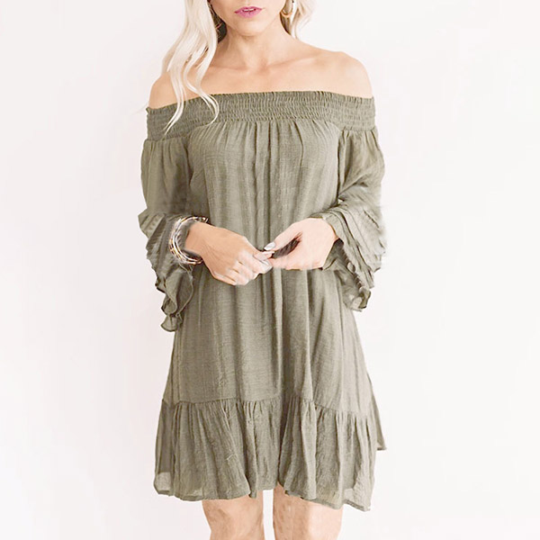 This dress can add a dash of sweet and flirty vibes to your look. Solid color style,the boat neck and lotus sleeve design make this piece look so attractive,while the loose silhouette design gives you a casual and relaxed style. You can add a thin waistband if you wanna enrich your dress up.