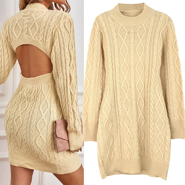 Sexig stickad klänning med kabelmönster och rund hals, långärmad och rygglös