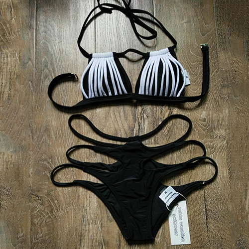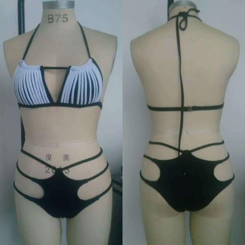 a halter bra and a hollow out briefs,sexy and chic. It is time for your to enjoy your seaside trip happily with this bikini set!