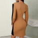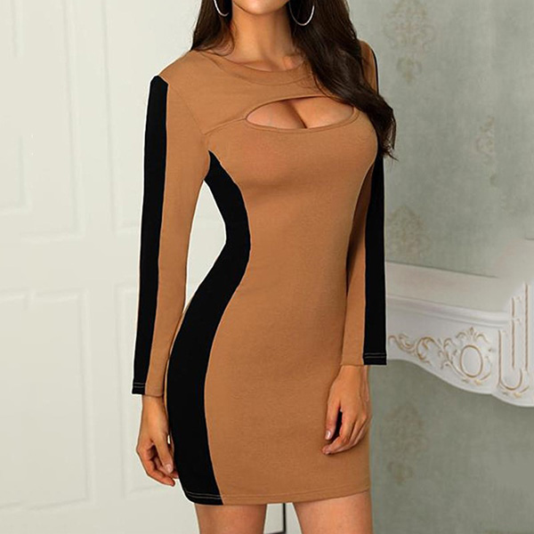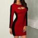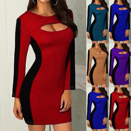 Sexy Contrast Color Long Sleeve Round Neck Slim Fit Hollow Out Dress