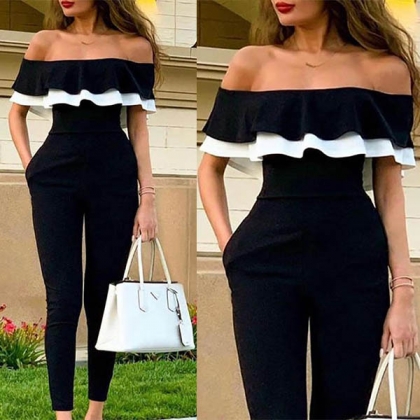 Sexy Contrast Color Ruffle Boat Neck High Waist Jumpsuit