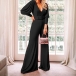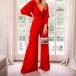 Sexig jumpsuit med djup V-ringning, lanternärm och hög midja i enfärgat