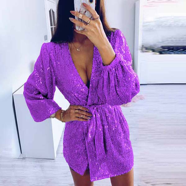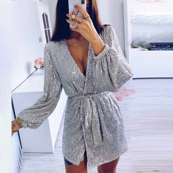 Sexy Deep V-neck Long Sleeve Irregular Hem Sequin Dress