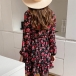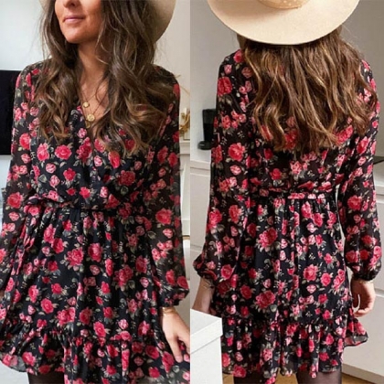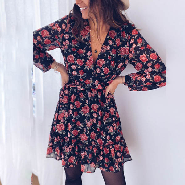 Sexy Deep V-neck Long Sleeve Ruffle Hem Printed Dress