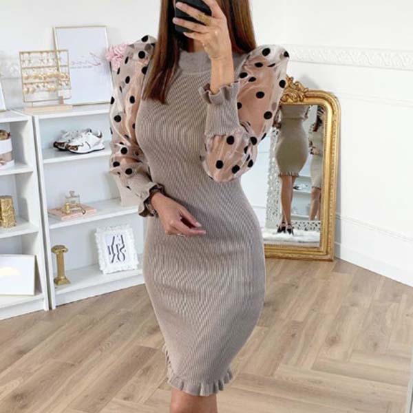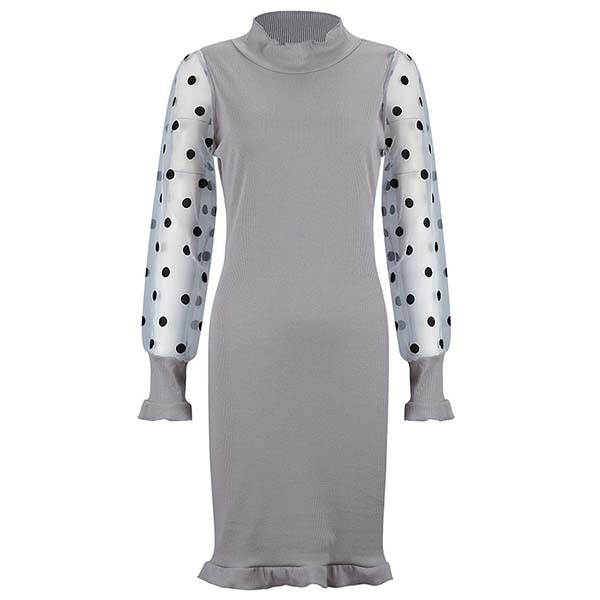 This dress is the one that will effortlessly enhance your feminine appeal. That's why we love this dress! The dots gauze spliced lantern sleeve design makes this piece look so sexy and flirty. Finished with mock neck and a fit silhouette,this dress also can showcase your slender figure. Perfect fit for these spring and autumn days.