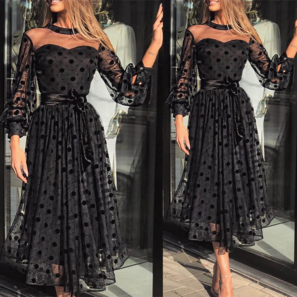 You can easily be the focus when you wear this breathtaking dress. The dots gauze spliced details and lantern sleeve design are the highlights,which make this piece full of flirty and distinctive vibes. When invited to a dinner date,you can trust in this dress to gain more compliments.