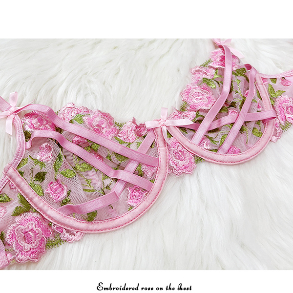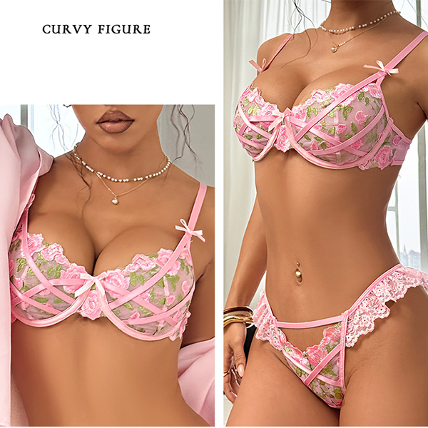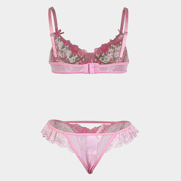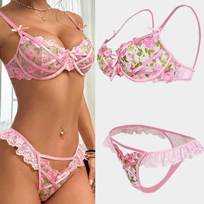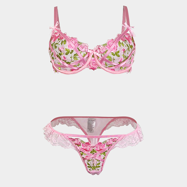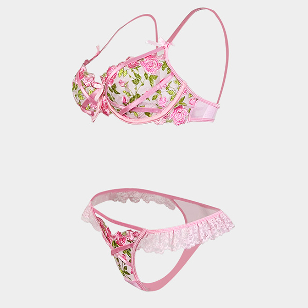 Underklädesset i spets – sexigt tvådelat set med blommigt broderi, korsvis knytning och volang