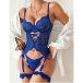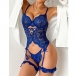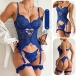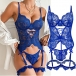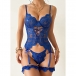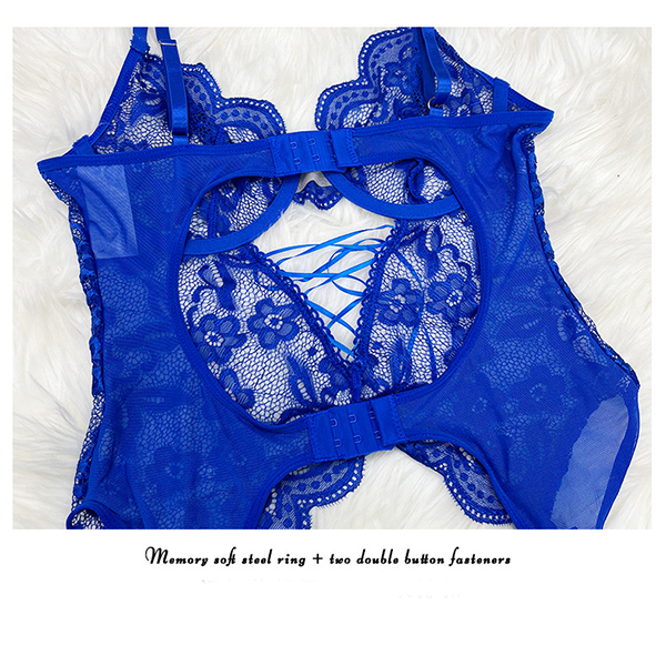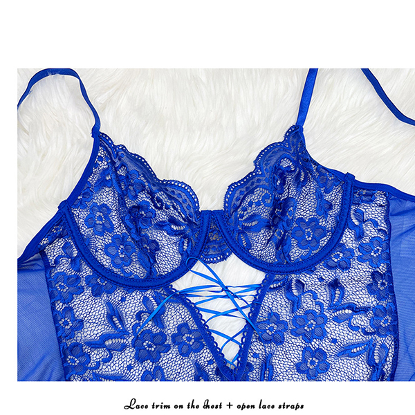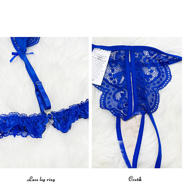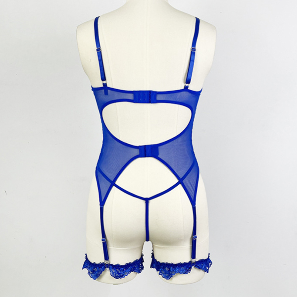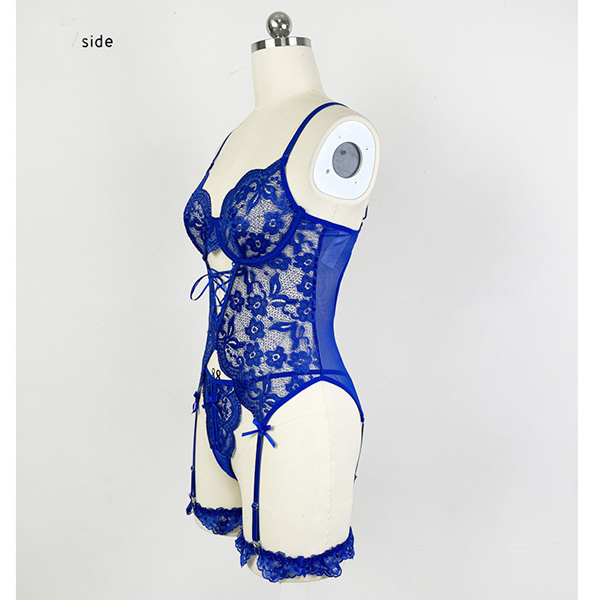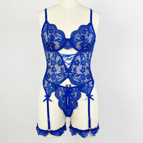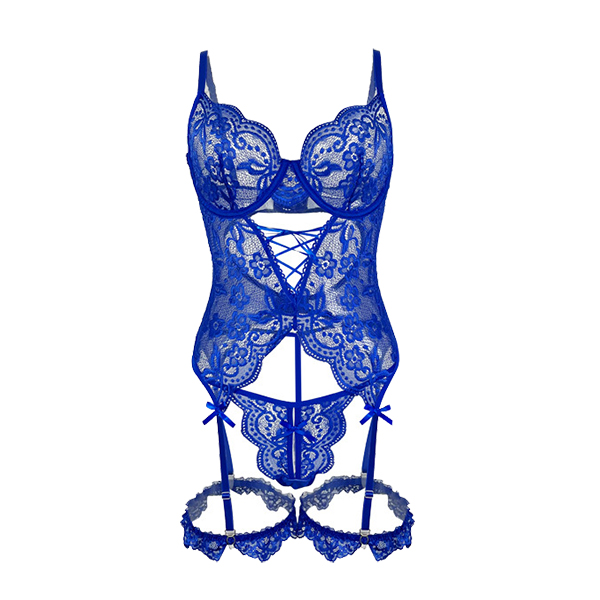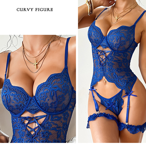 Tvådelat spetsset med broderat blommönster, snörning, rosett och volang – sexigt underklädesset