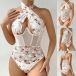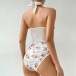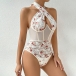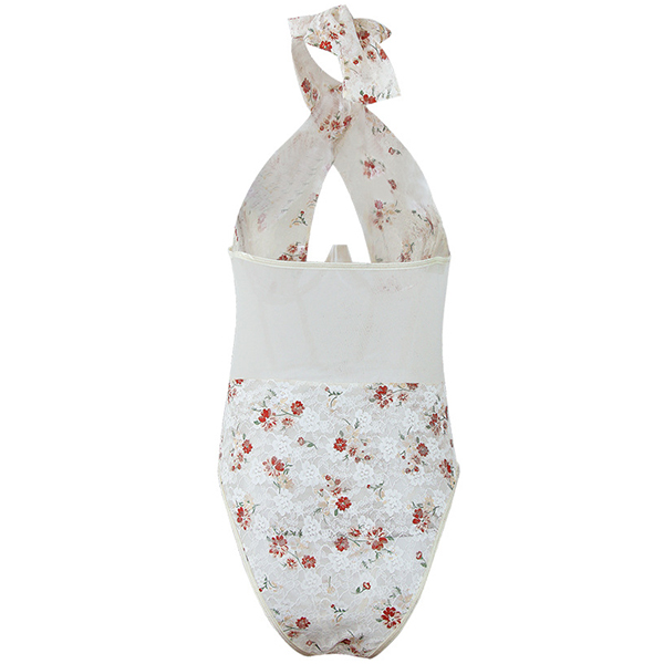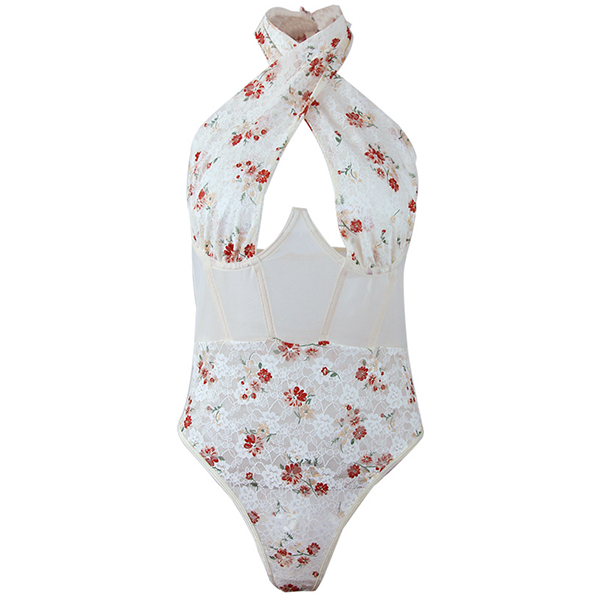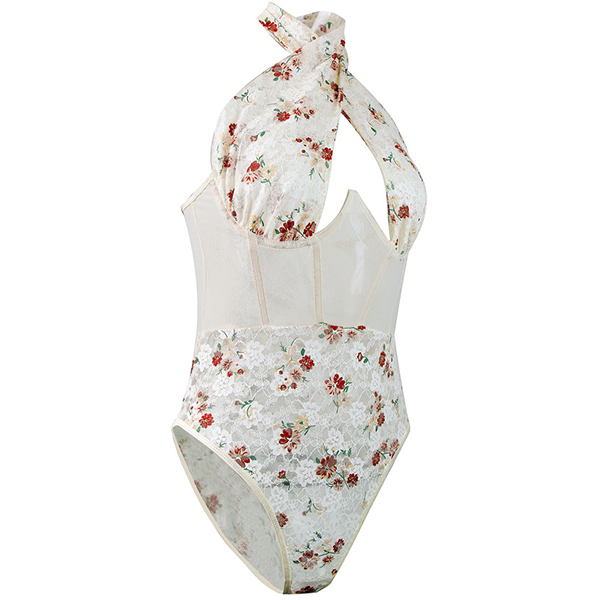 Sexig blommig tryckt spets korsett med främre skarvad utskärning och halterneck