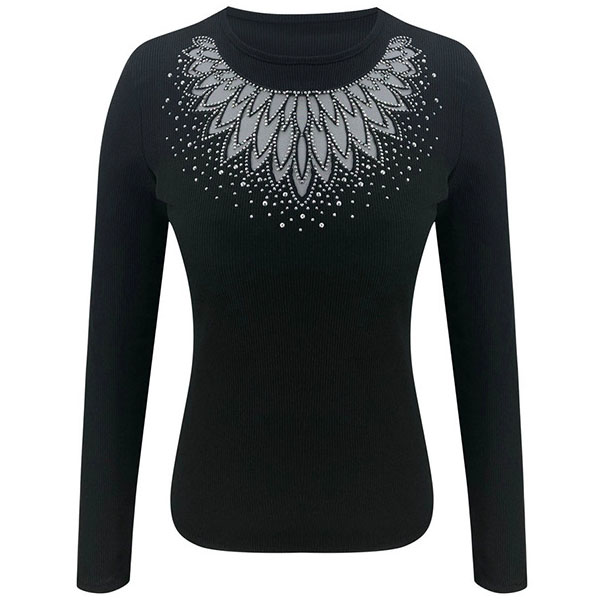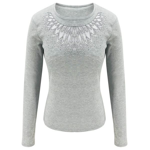Sexy Gauze Spliced Long Sleeve Round Neck Rhinestone Top