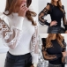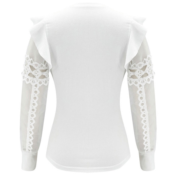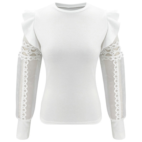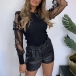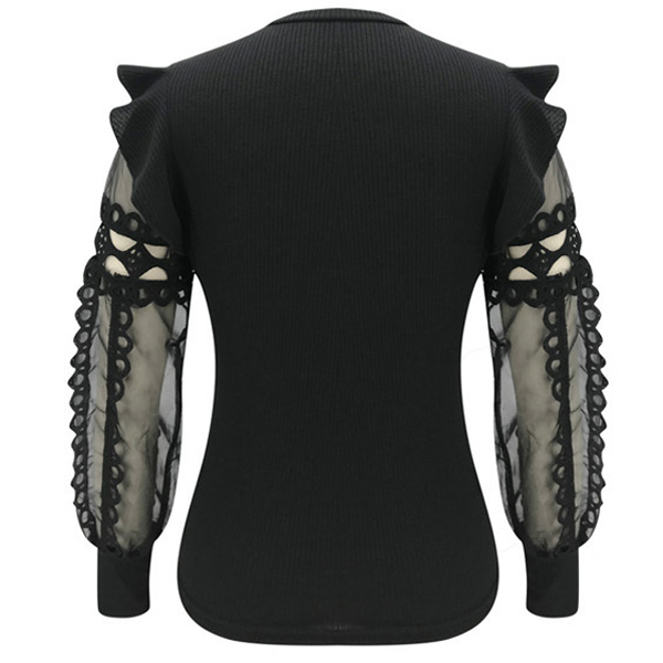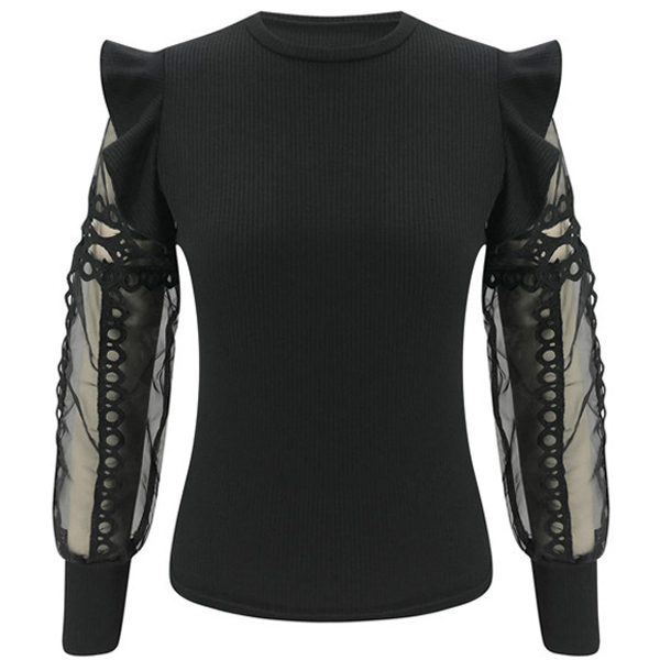 Sexy Gauze Spliced Long Sleeve Round Neck Slim Fit Top