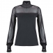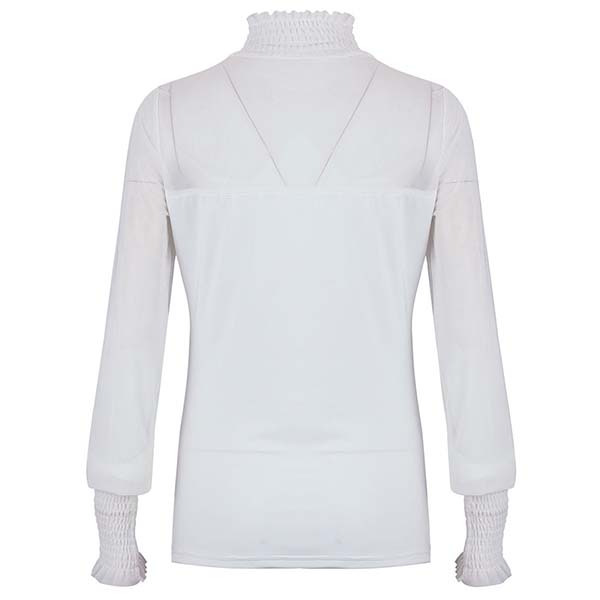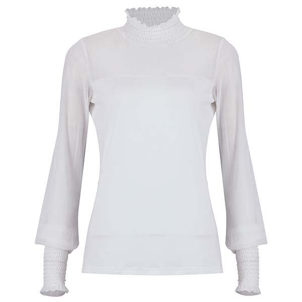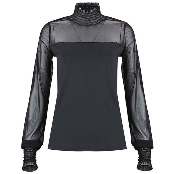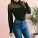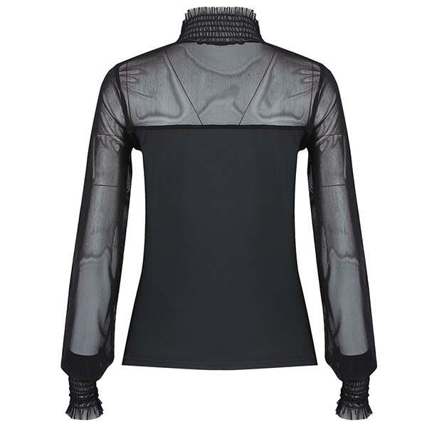 Sexy Gauze Spliced Long Sleeve Ruffle Stand Collar Solid Color Top