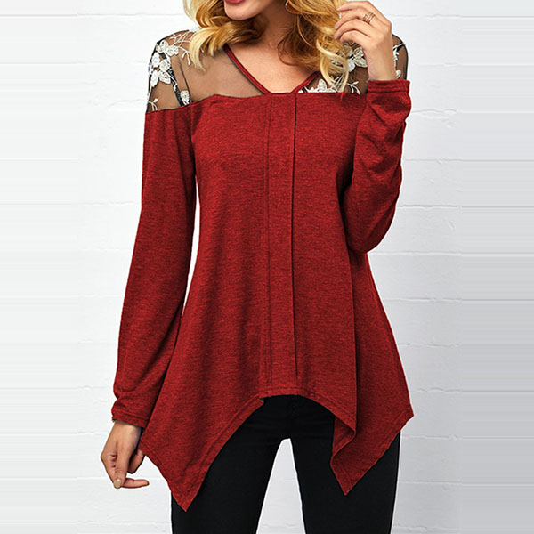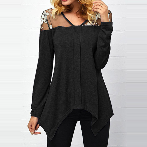 Sexy Gauze Spliced Long Sleeve V-neck Irregular Hem T-shirt