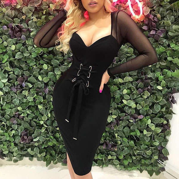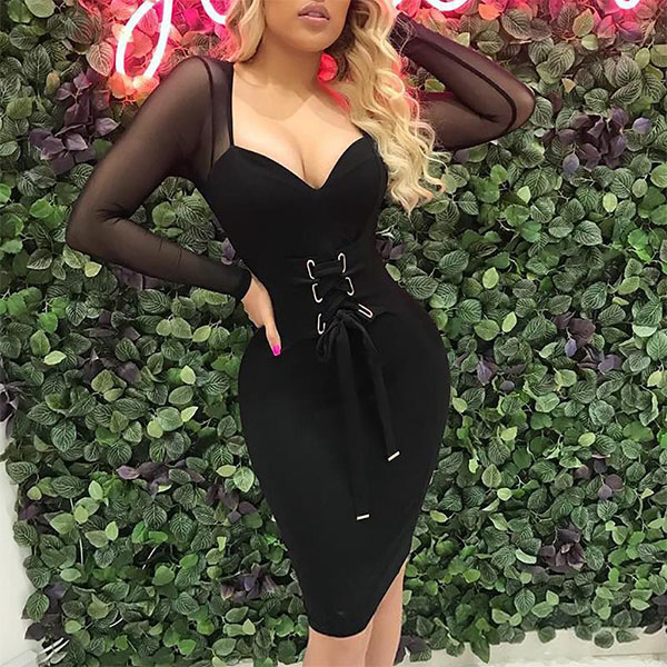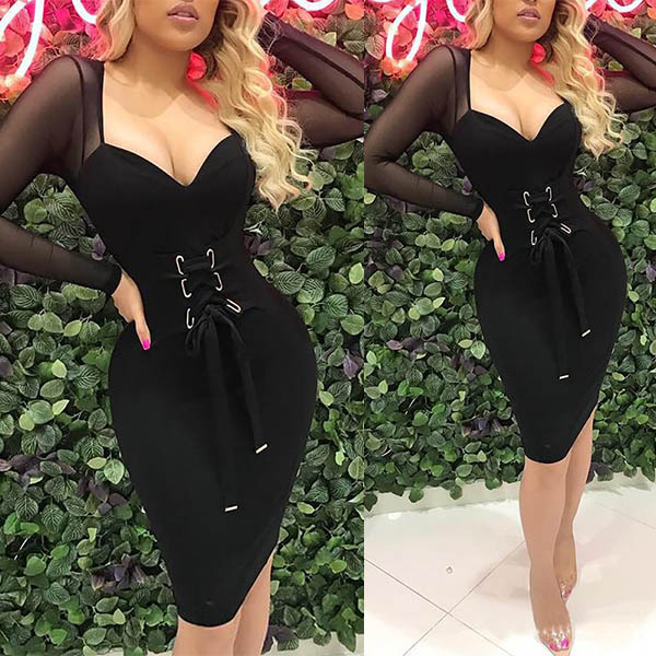 Sexy Gauze Spliced Long Sleeve V-neck Lace-up Slim Fit Dress
