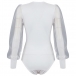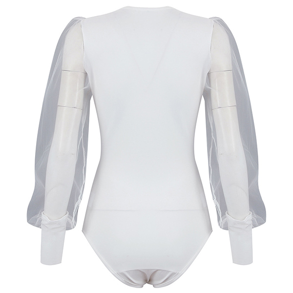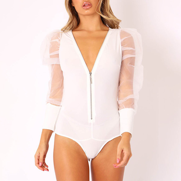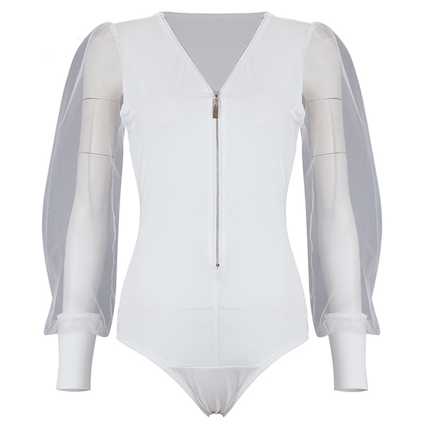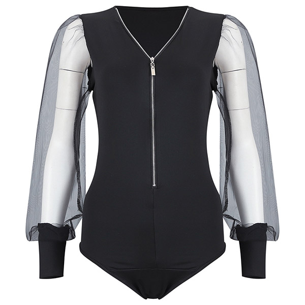 Sexy Gauze Spliced Long Sleeve Zipper V-neck Bodysuit