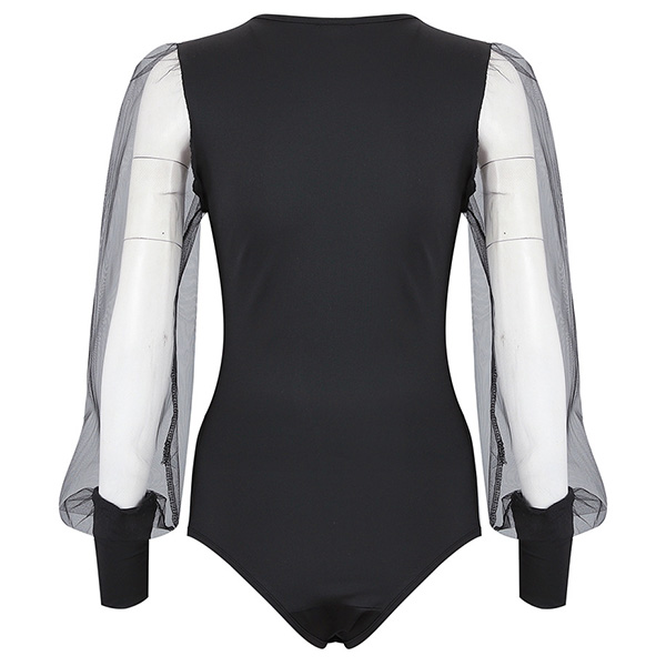 Add a dash of sexy and flirty vibes to your wardrobe with this bodysuit! Its alluring design details like see-through gauze spliced long sleeve and zipper v-neck design make this piece look so seductive. You can match with a high waist bottom to achieve for a stunning and sexy dress up.
