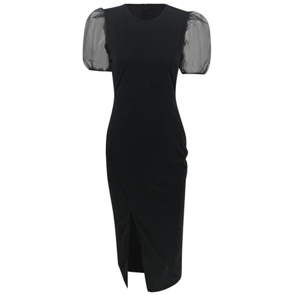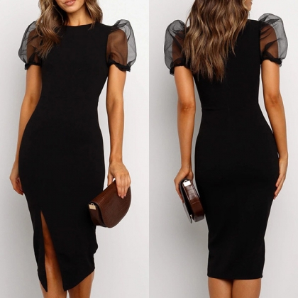 Sexy Gauze Spliced Puff Sleeve Slit Hem Slim Fit Dress