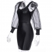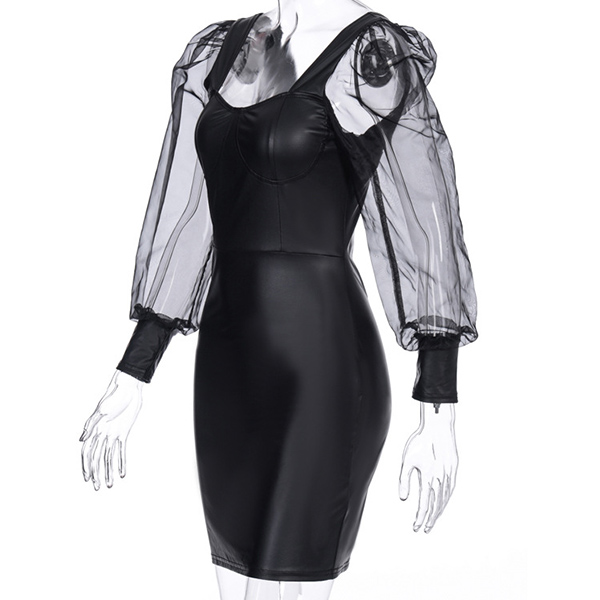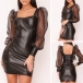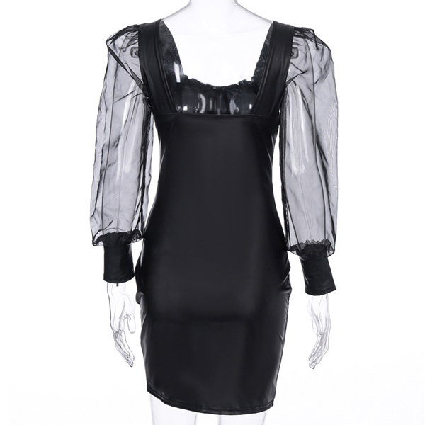 Sexy Gauze Spliced Puff Sleeve Square Collar PU Leather Dress