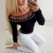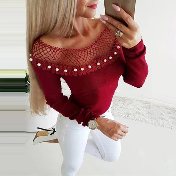 Sexy Hollow Out Gauze Spliced Long Sleeve Round Neck Beaded T-shirt