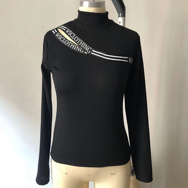 Sexy Hollow Out Letters Printed Long Sleeve Mock Neck Slim Fit Top