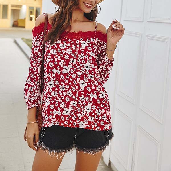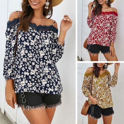 Make your wardrobe look more colorful by adding this top. Its eye-catching printed details can help you catch more eyes,while the lace spliced boat neck and sling design can make you look sexier. So why not slip into this piece to start your wonderful day!