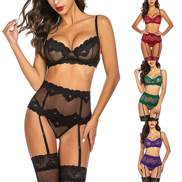 Sexig spetsdetaljerad gasvävs halvgenomskinlig tredelad underklädesset