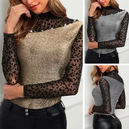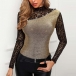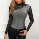 Sexy Lace Spliced Long Sleeve Mock Neck SLim Fit T-shirt