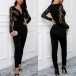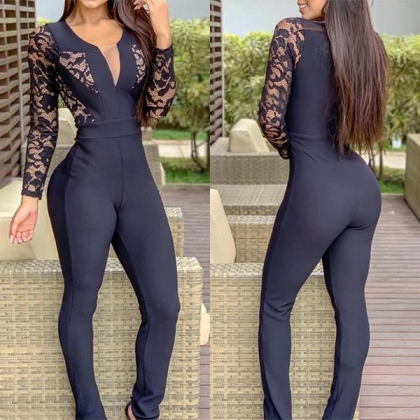 Sexy Lace Spliced Long Sleeve V-neck High Waist Slim Fit Jumpsuit