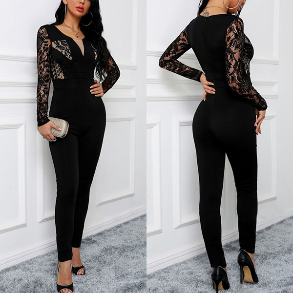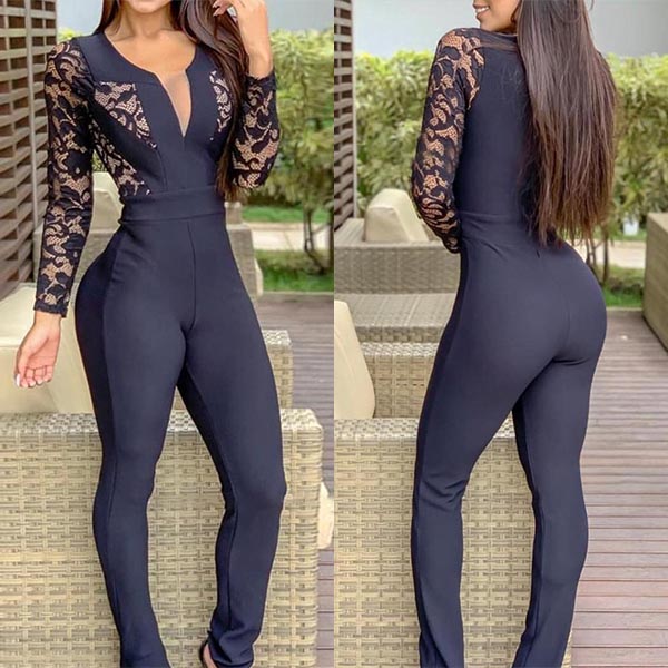 You can look exceptionally stunning and alluring when you slip into this jumpsuit! The lace spliced long sleeve and v-neck design can exude your sexy and feminine side,while the high waist and fit silhouette design can portray your slender figure. When you throw yourself into this piece,you can easily draw more attention.