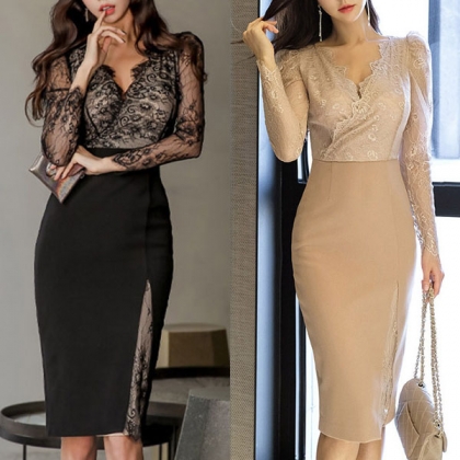 Still having no idea about what to wear for tonight's dinner date? Then make your eyes focused on this dress. The lace spliced details and v-neck design can enhance your feminine appeal,while the fit silhouette design will demonstrate your slender figure. Paired with your sexy heels and elegant clutch,you can look stunning enough!