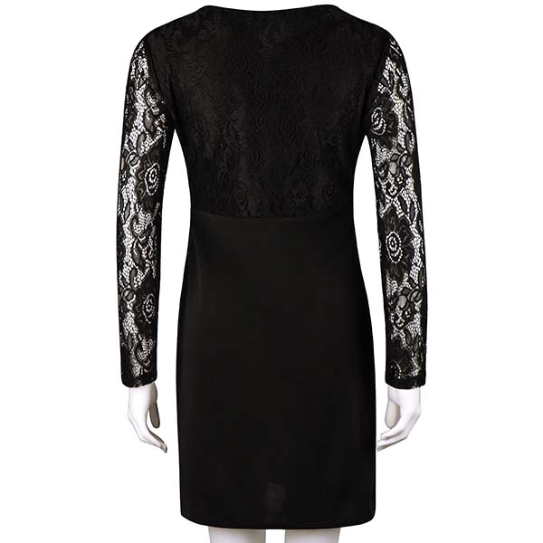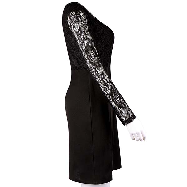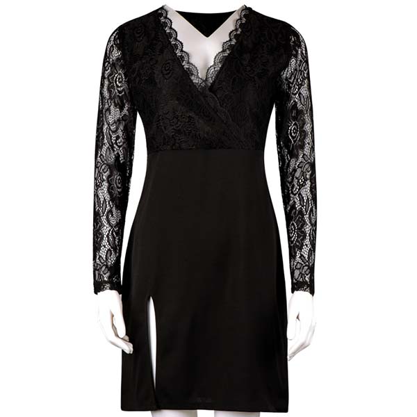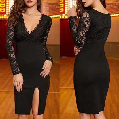 Sexy Lace Spliced Long Sleeve V-neck Slit Hem Slim Fit Dress