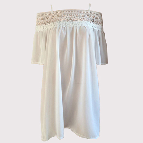 Crafted from soft and flowy fabric, this dress features off shoulder and lace spliced with feminine