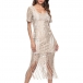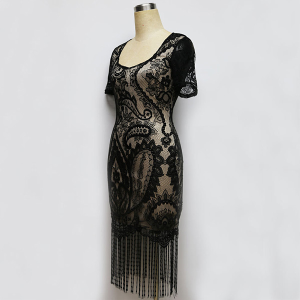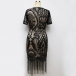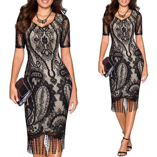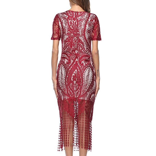 Sexy Lace Spliced Short Sleeve V-neck Tassel Hem Slim Fit Dress