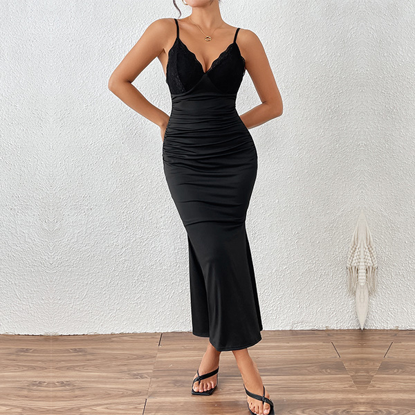 Denna svarta klänning har spetsskarvning längs den djupa V-ringningen, en rygglös design och en fiskstjärtskant för en dramatisk och elegant look. Vågar du prova?