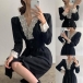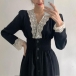 Sexy Lace Spliced V-neck Long Sleeve High Waist Dress