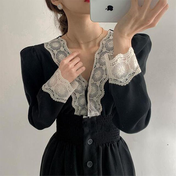 Exude the allure of an elegant lady when you slip into this dress. The lace spliced details the the neckline and cuff part make this piece look so attractive,while the high waist can showcase your perfect figure. You can trust in this dress to help you gain more compliments when you're out and about.