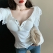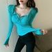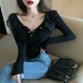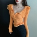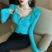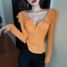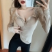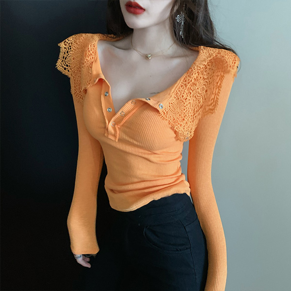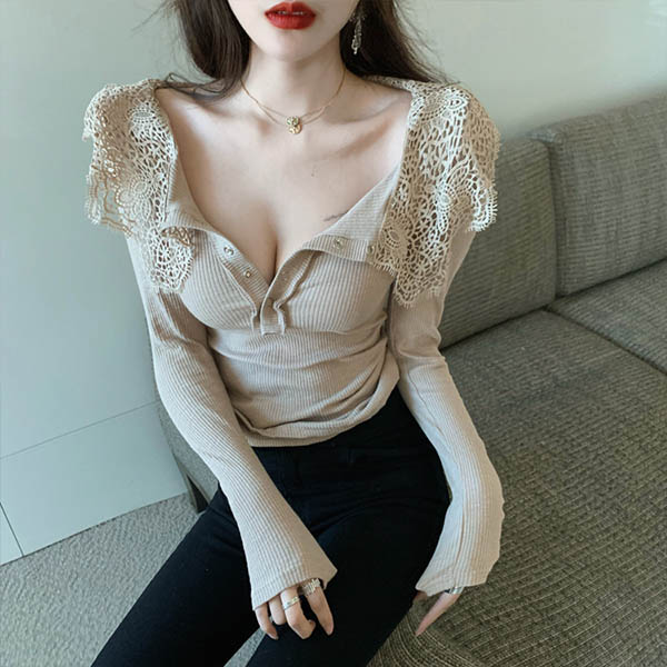 Sexy Lace Spliced V-neck Long Sleeve Slim Fit T-shirt