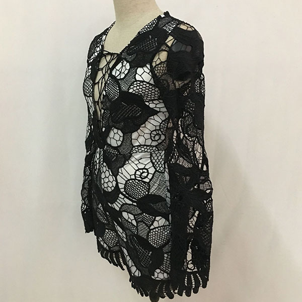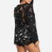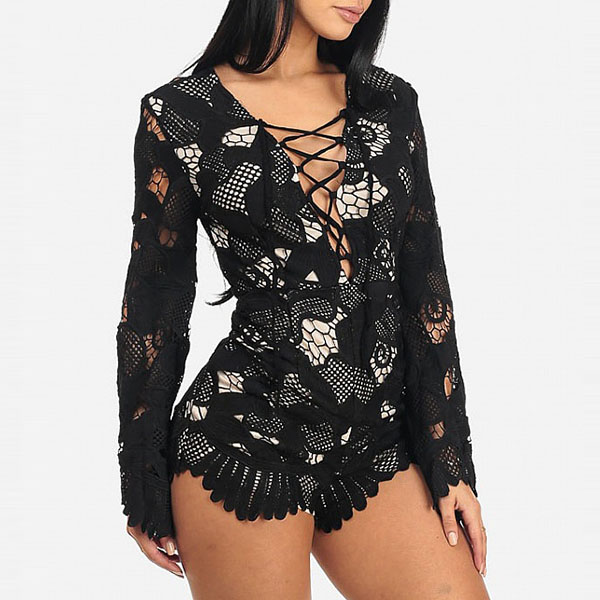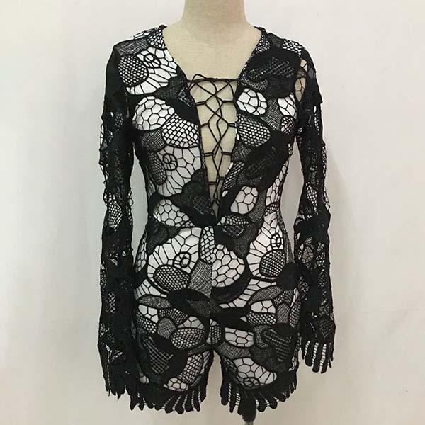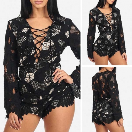 Sexy Lace-up Deep V-neck Lace Spliced Long Sleeve Slim Fit Romper