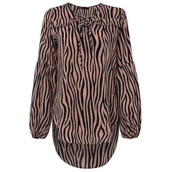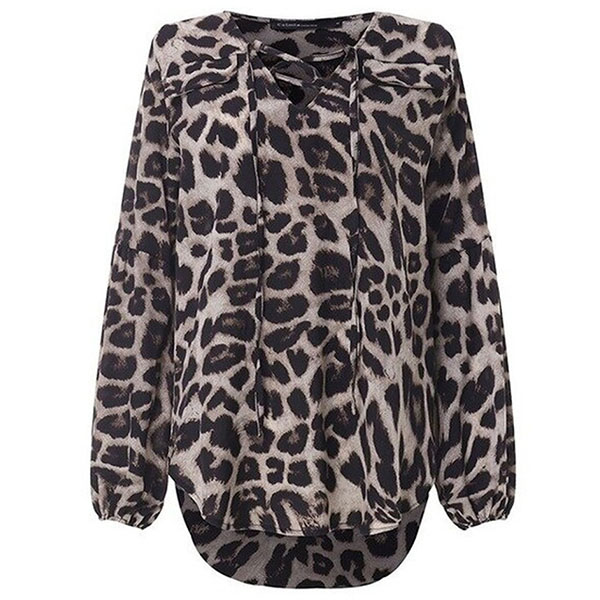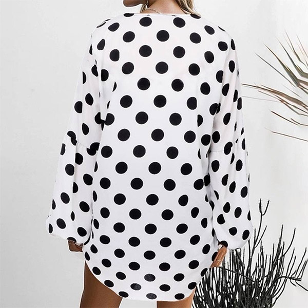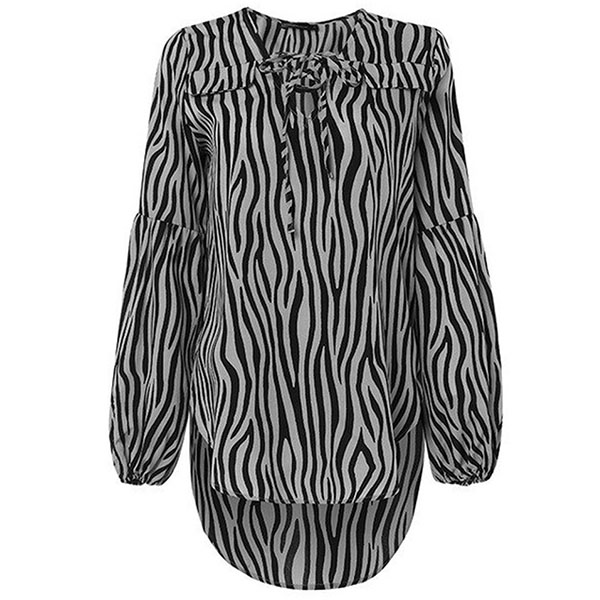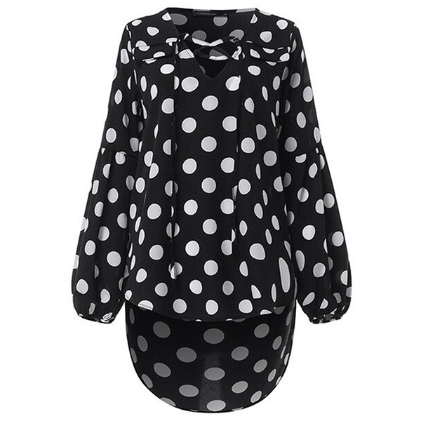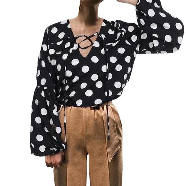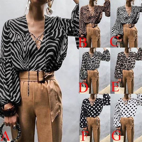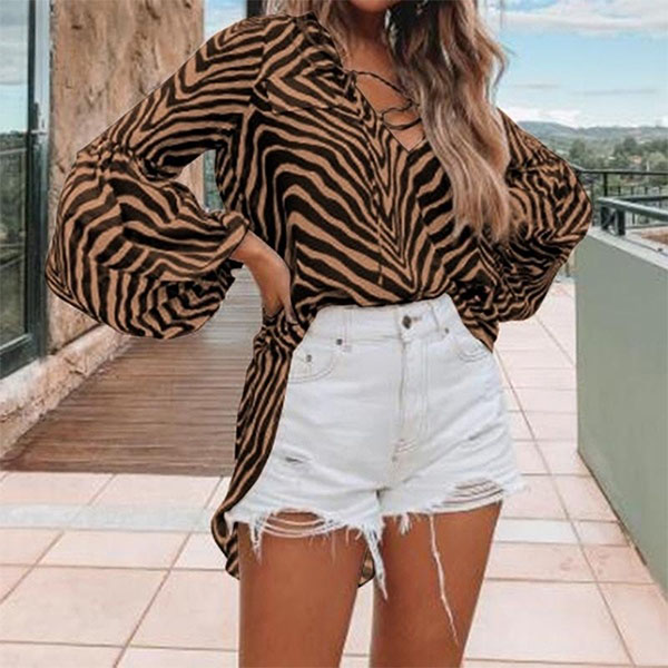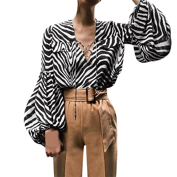 Thanks to the chic and eye-catching printed details,you can easily arouse more attention when you wear this blouse. Moreover,the lace-up v-neck,lantern sleeve and high-low hem design will make this piece look more attractive. So why not enrich your wardrobe with this wonderful piece?